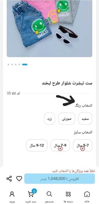 مرحله دوم : دکمه خرید در این حالت غیر فعال است ابتدا باید ویژگی های مورد نظر محصول را انتخاب کنیم و سپس دکمه افزودن به سبد خرید فعال میشود