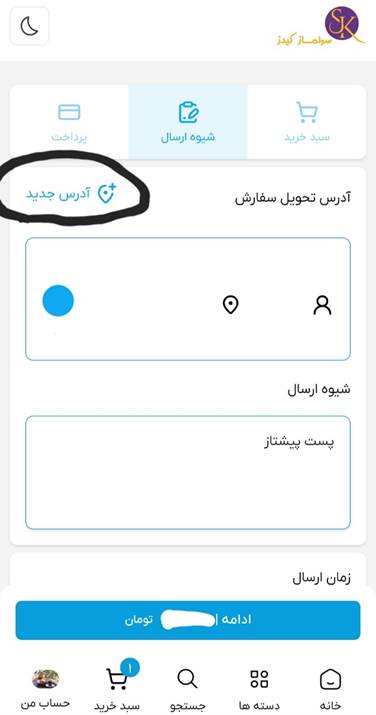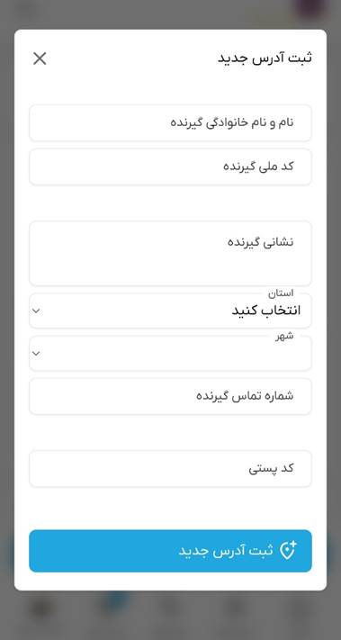 مرحله ششم : از قسمت بالا سمت چپ گزینه آدرس جدید را بزنید و مشخصات خود و آدرس محل دریافت را وارد کنید