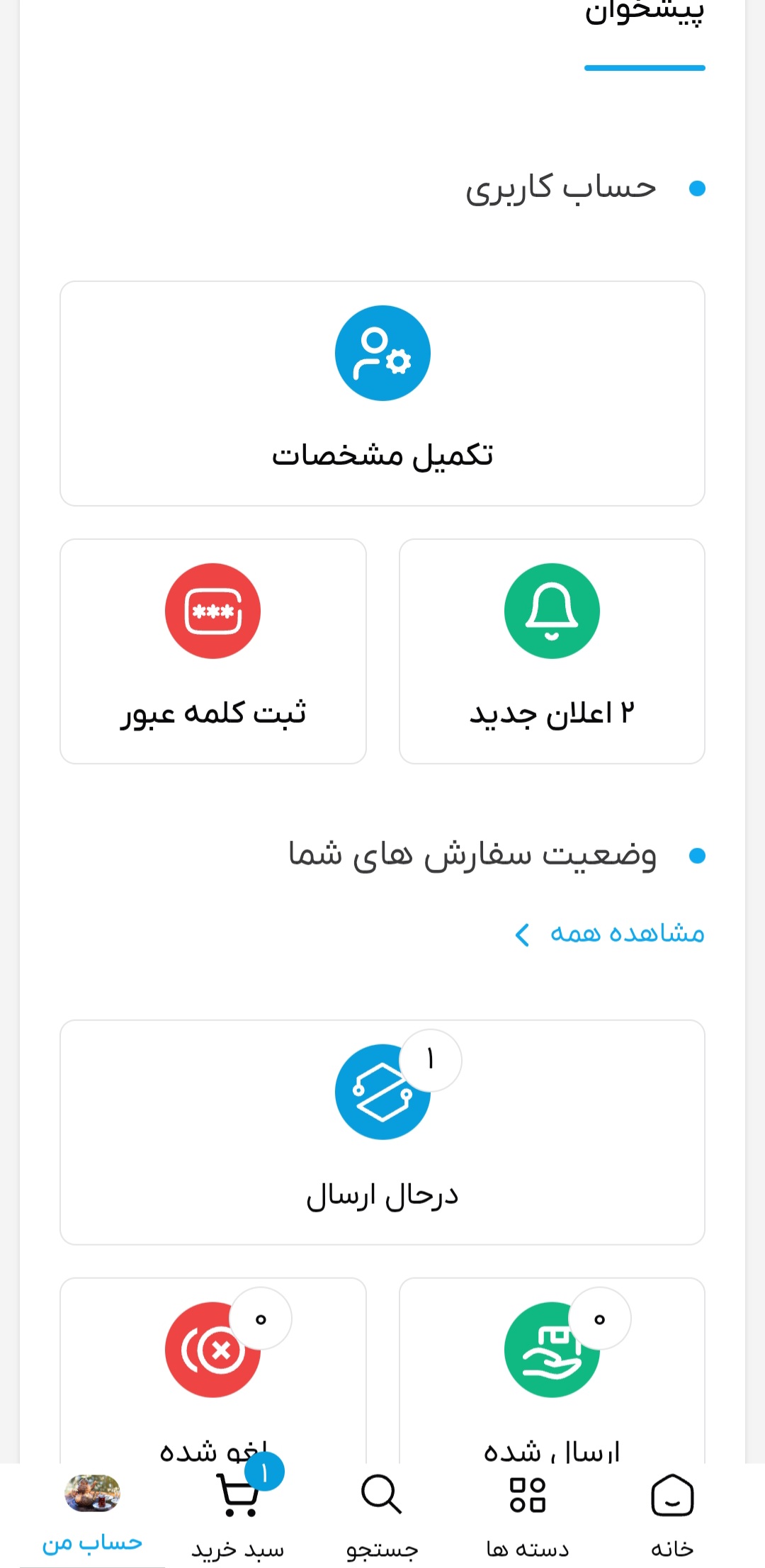 از قسمت پایین در حالت موبایل یا از قسمت بالا در حالت دسکتاپ وارد حساب من شوید، در قسمت پیشخوان گزینه وضعیت سفارش های من را مشاهده میکنید، روی مشاهده همه کلیک کنید